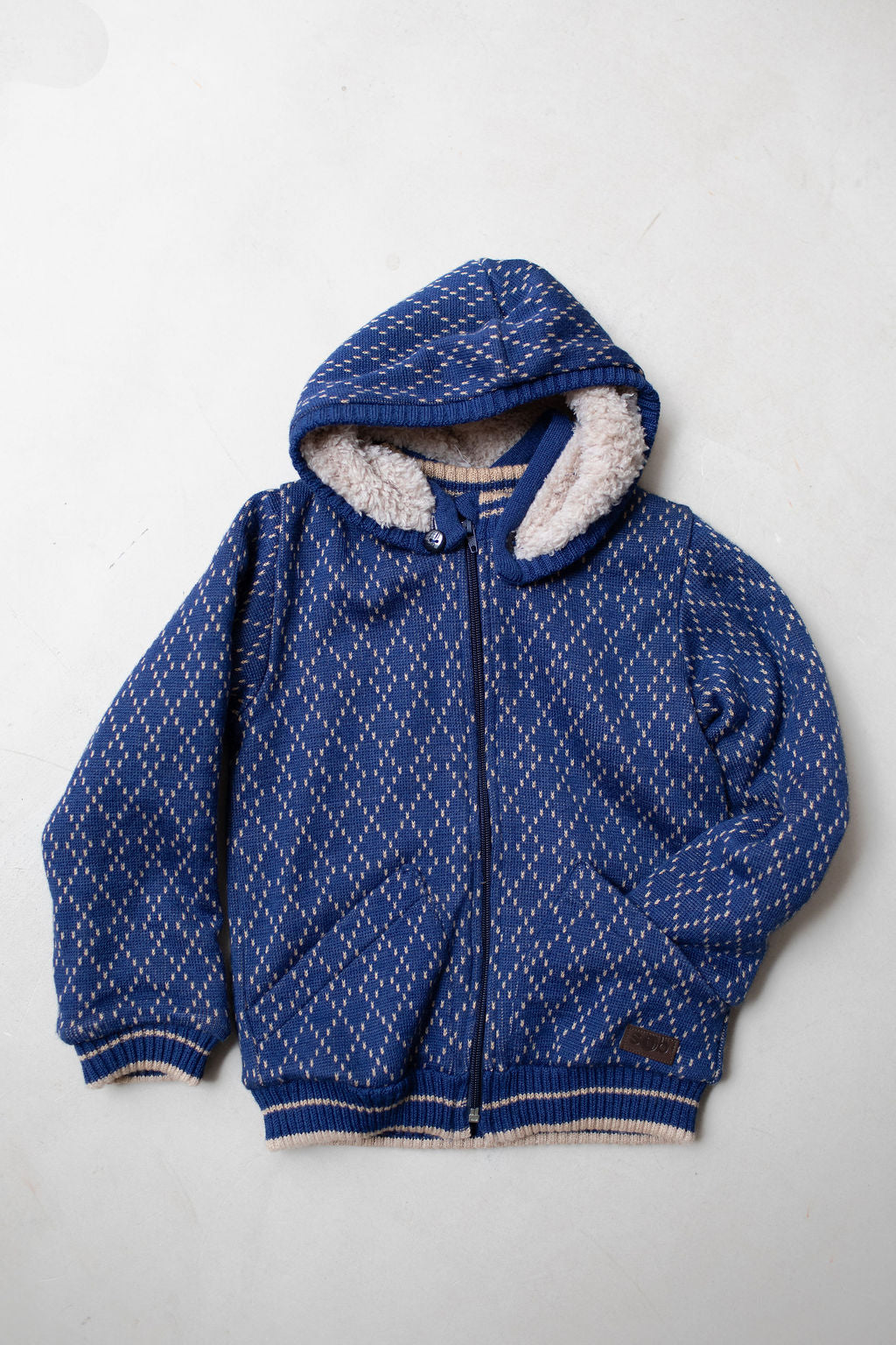 Chamarra tejida forrada con borrega. Con capucha desprendible